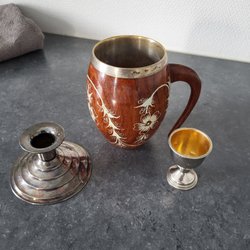 Mugg, ljusstake och äggkopp i metall och trä