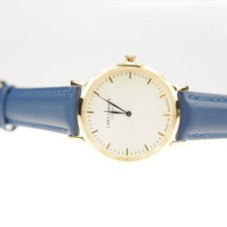 Lars Larsen klocka med blå läderrem och guldfärgat ur.