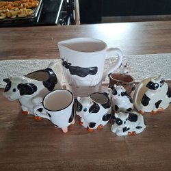Kollektion med ko-tema: kannor, muggar, tavlor och hängande ko