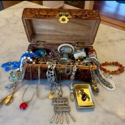 Stort smyckespaket, samling smycken och kuriosa från dödsbo, smyckeskrin