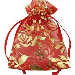 25 st. Handsydda Organza påsar Röda med guldfärgad blomtryck c:a 7X9 cm.