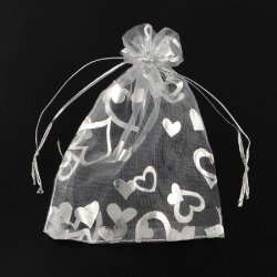 *10 st. Handsydda Organza påsar c.a 7x9 cm..Vita med silverhjärter