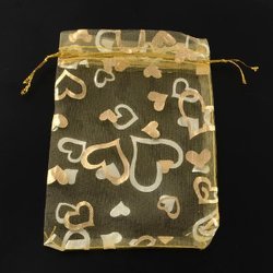 10 st. Handsydda Organza påsar c.a 7x9 cm. Ljus Orange med guldhjärter