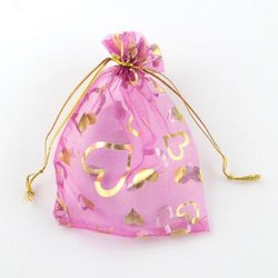 25 st. Handsydda Rosa med guldhjärter Organza påsar c.a 7x9 cm.