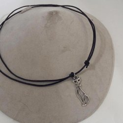 Handknuten Ställbar svart läder halsband med kattformad hänge