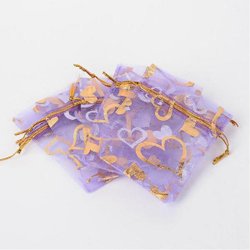 10 st. Handsydda Organza påsar c.a 7x9 cm. Lila med guldhjärter