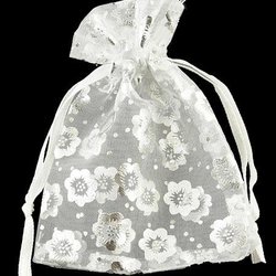 10 st Handsydda Organza påsar c.a 7x9 cm.Vita med silverblommor