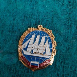Brosch CEDOB/SEDOV Skepp 3-mastare Vit med Blå bakgrund Dia ca 5 cm
