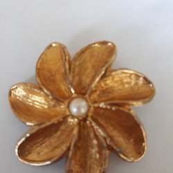 Brosch 80-tal i Guldig Metall Pärla i Pärlemor i mitten Diameter 5 cm