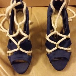 Skor Pumps Slingback Stilettklack Mörkblå Satin Vita Snören Storlek 38
