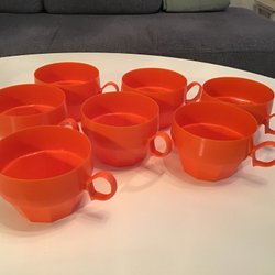 Bilå muggar i plast. Gula + Gröna 70/80-tal. Orange 60/70-tal.