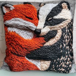 Mysigt kuddfodral med räv och tvättbjörn som kramas
