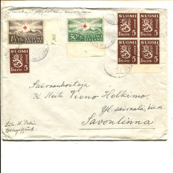 Finland Red Cross 1.25Mk+50c and Lion 5x5p on cover, Dragsfjärd 17.5.1940
