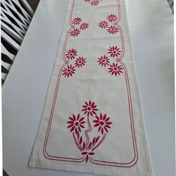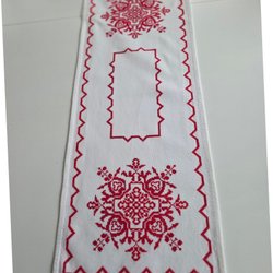 Handbroderad jullöpare i rött på vit väv