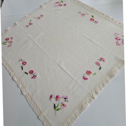 Stor handbroderad duk med spets 98×98 cm